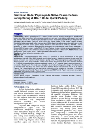 Mutiara, Adinda Rahma and Ade, Asyari and Yustini, Alioes and Husnil, Kadri and Gusti, Revilla (2023) Gambaran kadar pepsin pada saliva pasien refluks laringofaring di RSUP Dr. M. Djamil Padang. Jurnal Otorinolaringologi Kepala dan Leher Indonesia, 2 (1): 4. pp. 26-31. ISSN 2961-7480