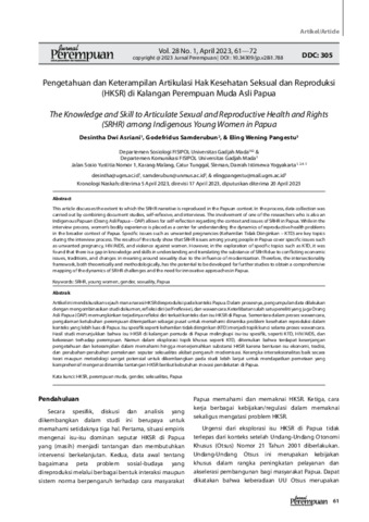 Desintha, Dwi Asriani and Godefridus, Samderubun and Eling, Wening Pangestu (2023) Pengetahuan dan keterampilan Artikulasi Hak Kesehatan Seksual dan Reproduksi (HKSR) di kalangan perempuan muda asli Papua. Jurnal Perempuan, 28 (1): 6. pp. 61-72. ISSN 1410-153X