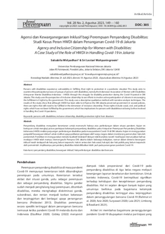 Salsabila, Widyadhari and Sri, Lestari Wahyuningroem (2023) Agensi dan kewarganegaraan inklusif bagi perempuan penyandang disabilitas: studi kasus peran HWDI dalam penanganan Covid-19 di Jakarta. Jurnal Perempuan, 28 (2): 5. pp. 149-160. ISSN 1410-153X