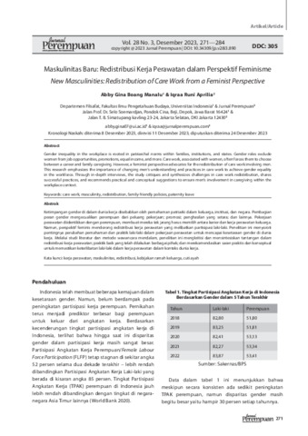 Abby, Gina Boang Manalu and Iqraa, Runi Aprilia (2023) Maskulinitas baru: redistribusi kerja perawatan dalam perspektif feminisme. Jurnal Perempuan, 28 (3): 7. pp. 271-284. ISSN 1410-153X