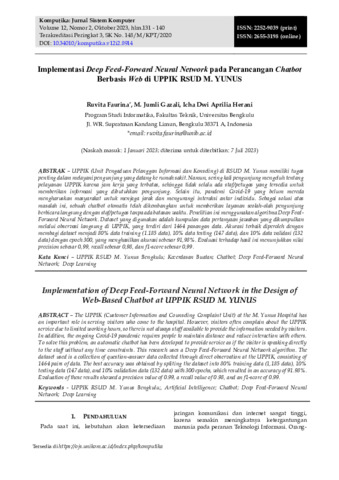 UPPIK (Unit Pengaduan Pelanggan Informasi dan Konseling) di RSUD M. Yunus memiliki tugas penting dalam melayani pengunjung yang datang ke rumah sakit. Namun, sering kali pengunjung mengeluh tentang pelayanan UPPIK karena jam kerja yang terbatas, sehingga tidak selalu ada staf/petugas yang tersedia untuk memberikan informasi yang dibutuhkan pengunjung. Selain itu, pandemi Covid-19 yang belum mereda mengharuskan masyarakat untuk menjaga jarak dan mengurangi interaksi antar individu. Sebagai solusi atas masalah ini, sebuah chatbot otomatis telah dikembangkan untuk memberikan layanan seolah-olah pengunjung berbicara langsung dengan staf/petugas tanpa ada batasan waktu. Penelitian ini menggunakan algoritma Deep Feed Forward Neural Network. Dataset yang digunakan adalah kumpulan data pertanyaan jawaban yang dikumpulkan melalui observasi langsung di UPPIK, yang terdiri dari 1464 pasangan data. Akurasi terbaik diperoleh dengan membagi dataset menjadi 80% data training (1.185 data), 10% data testing (147 data), dan 10% data validasi (132 data) dengan epoch 300, yang menghasilkan akurasi sebesar 91,98%. Evaluasi terhadap hasil ini menunjukkan nilai precision sebesar 0,99, recall sebesar 0,98, dan f1-score sebesar 0,99.