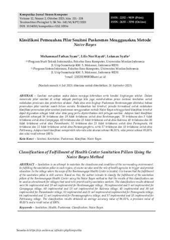 Muhammad Farhan, Syam and Lilis Nur, Hayati and Lukman, Syafie (2023) Klasifikasi pemenuhan pilar sanitasi puskesmas menggunakan metode Naive Bayes. Komputika: Jurnal Sistem Komputer, 12 (2): 12. pp. 221-228. ISSN 2252-9039