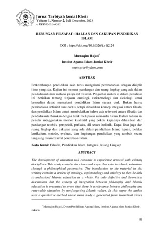 Mustaqim, Hajati (2023) Renungan filsafat: Haluan dan cakupan pendidikan Islam. Jurnal Tarbiyah Jamiat Kheir, 1 (2): 2. pp. 89-106. ISSN 3026-4332