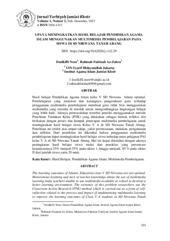 Dzulkifli, Noor and Rahmah, Fatimah Az-Zahra (2023) Upaya meningkatkan hasil belajar pendidikan agama Islam menggunakan multimedia pembelajaran siswa di SD Nirwana Tanah Abang. Jurnal Tarbiyah Jamiat Kheir, 1 (2): 4. pp. 125-143. ISSN 3026-4332