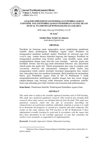 M., Sony (2023) Analisis implementasi pendekatan pembelajaran saintifik dalam pembelajaran pendidikan agama Islam di SD Al Wathoniyah 09 Penggilingan Jakarta. Jurnal Tarbiyah Jamiat Kheir, 1 (2): 5. pp. 144-161. ISSN 3026-4332