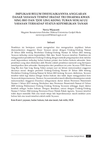 Novia, Wijayanti (2022) Implikasi belum disesuaikannya anggaran dasar Yayasan Tempat Ibadat Tri Dharma Kwan Sing Bio dan Tjoe Ling Kiong Tuban sesuai UU Yayasan terhadap status kepemilikan tanah. Proceeding Universitas Gadjah Mada Notary Law Conference And Call For Paper, 1: 4. pp. 67-84. ISSN 3025-7220