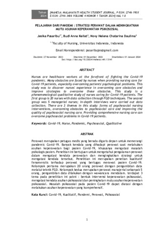 Jesika, Pasaribu and Budi, Anna Keliat and Novy, Helena Chatarina Daulima (2024) Pelajaran dari pandemi: Strategi perawat dalam meningkatkan mutu asuhan keperawatan psikososial. MAHESA: Malahayati Health Student Journal, 4 (1): 1. pp. 1-8. ISSN 2746-198X