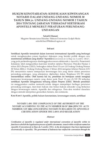 Salsabil, Hanani (2022) Hukum kenotariatan: kesesuaian kewenangan notaris dalam Undang-Undang Nomor 30 Tahun 2004 Jo. Undang-Undang Nomor 2 Tahun 2014 Tentang Jabatan Terhadap Sertifikasi Apostille menurut Peraturan Perundang-Undangan. Proceeding Universitas Gadjah Mada Notary Law Conference And Call For Paper, 1: 5. pp. 85-96. ISSN 3025-7220