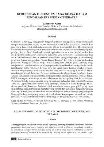 Alfiansyah, Azhar (2022) Kedudukan hukum lembaga kuasa dalam pendirian Perseroan Terbatas. Proceeding Universitas Gadjah Mada Notary Law Conference and Call For Paper, 1: 11. pp. 192-213. ISSN 3025-7220
