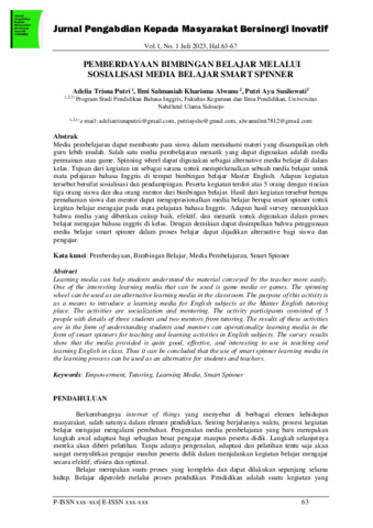 Adelia, Trisna Putri and Ilmi, Salmaniah Kharisma Alwanu and Putri, Ayu Susilowati (2023) Pemberdayaan bimbingan belajar melalui sosialisasi media belajar smart spinner. Jurnal Pengabdian Kepada Masyarakat Bersinergi Inovatif, 1 (1): 10. pp. 63-67. ISSN 2988-6902