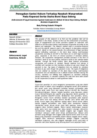 Baiq, Nining Sulastri Ningsih (2023) Penegakan sanksi hukum terhadap nasabah wanprestasi pada koperasi serba usaha Bumi Raya Selong. JURIDICA: Jurnal Fakultas Hukum Universitas Gunung Rinjani, 5 (1): 1. pp. 4-9. ISSN 2722-242X