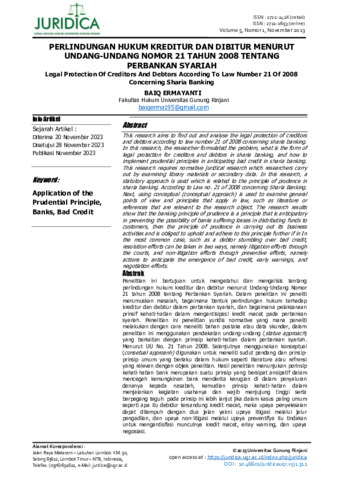 Baiq, Ermayanti (2023) Perlindungan hukum kreditur dan dibitur menurut Undang-Undang Nomor 21 Tahun 2008 tentang Perbankan Syariah. JURIDICA: Jurnal Fakultas Hukum Universitas Gunung Rinjani, 5 (1): 3. pp. 18-23. ISSN 2722-242X