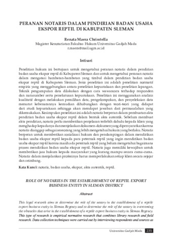 Renata, Maera Chrisstella (2022) Peranan notaris dalam pendirian badan usaha ekspor reptil di Kabupaten Sleman. Proceeding Universitas Gadjah Mada Notary Law Conference and Call For Paper, 1: 13. pp. 235-253. ISSN 3025-7220