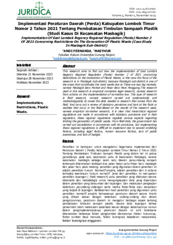 Andi, Fernanda and Masyhur, Masyhur (2023) Implementasi Peraturan Daerah (Perda) Kabupaten Lombok Timur Nomor 2 Tahun 2021 Tentang Pembatasan Timbulan Sampah Plastik: studi kasus di Kecamatan Masbagik. JURIDICA: Jurnal Fakultas Hukum Universitas Gunung Rinjani, 5 (1): 8. pp. 54-62. ISSN 2722-242X