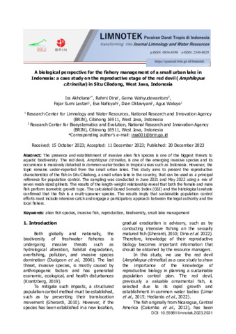 Ira, Akhdiana and Rahmi, Dina and Gema, Wahyudewantoro and Fajar, Sumi Lestari and Eva, Nafisyah and Dian, Oktaviyani and Agus, Waluyo (2023) A biological perspective for the fishery management of a small urban lake in ndonesia: a case study on the reproductive stage of the red devil (Amphilopus citrinellus) in Situ Cilodong, West Java, Indonesia. Limnotek : Perairan Darat Tropis di Indonesia transforming into Journal of Limnology and Water Resources, 29 (1): 2. pp. 1-8. ISSN 0854-8390