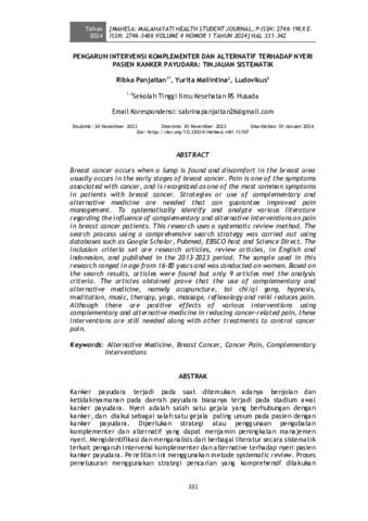 Ribka, Panjaitan and Yurita, Mailintina and Ludovikus, Ludovikus (2024) Pengaruh intervensi komplementer dan alternatif terhadap nyeri pasien kanker payudara: Tinjauan sistematik. MAHESA: Malahayati Health Student Journal, 4 (1): 30. pp. 331-342. ISSN 2746-198X