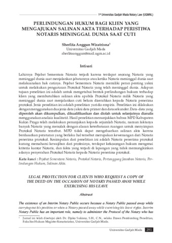 Sherlita, Anggun Wiratrisna Perlindungan hukum bagi klien yang mengajukan salinan akta terhadap peristiwa notaris meninggal dunia saat cuti. Proceeding Universitas Gadjah Mada Notary Law Conference and Call For Paper, 1: 16. pp. 291-311. ISSN 3025-7220