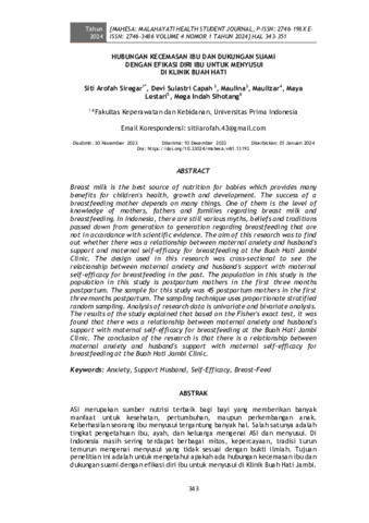 Siti, Arofah Siregar and Devi, Sulastri Capah and Maulina, Maulina and Maulizar, Maulizar and Maya, Lestari and Mega, Indah Sihotang (2024) Hubungan kecemasan ibu dan dukungan suami dengan efikasi diri ibu untuk menyusui di Klinik Buah Hati. MAHESA: Malahayati Health Student Journal, 4 (1): 31. pp. 343-351. ISSN 2746-198X