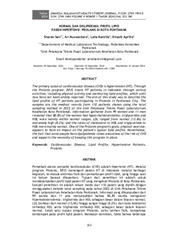Sharen, Sen and Ari, Nuswantoro and Laila, Kamilla and Dinasti, Aprilia (2024) Normal dan dislipidemia: Profil lipid pasien hipertensi-prolanis di Kota Pontianak. MAHESA: Malahayati Health Student Journal, 4 (1): 32. pp. 352-360. ISSN 2746-198X