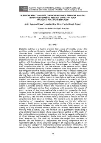 Andri, Kusuma Wijaya and Apeliani, Dwi Gita and Fatsiwi, Nunik Andari (2024) Hubungan kepatuhan diet, dukungan keluarga terhadap kualitas hidup pasien diabetes mellitus di wilayah kerja Puskesmas Nusa Indah Bengkulu. Manuju: Malahayati Nursing Journal, 6 (1): 6. pp. 58-73. ISSN 2655-2728