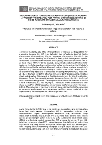 Siti, Nurwiyah and Wintarsih, Wintarsih (2024) Pengaruh edukasi tentang Inisiasi Menyusui Dini (IMD) dan bounding attachment terhadap ibu post partum untuk proses menyusui di Poned Puskesmas Rawamerta Kabupaten Karawang. Manuju: Malahayati Nursing Journal, 6 (1): 8. pp. 82-90. ISSN 2655-2728