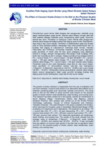 Pertumbuhan ayam broiler tidak terlepas dari penggunaan antibiotik yang dapat membahayakan pada ternak. Ekstrak sabut kelapa menjadi alternatif feed additivesebagai antibiotik yang mengandung asam galat, flavonoid, steroid dan tanin. Penelitian ini bertujuan untuk melihat efek penggunaan ekstrak sabut kelapa terhadap kualitas fisik daging ayam broiler (keempukan, daya ikat air dan susut masak). Penelitian ini dilaksanakan pada dua tempat yaitu di Desa Sibalaya Selatan, Kabupaten Sigi untuk pemeliharaandanuji kualitas fisik daging di Laboratorium Teknologi Hasil Ternak, Fakultas Peternakan dan Perikanan, Universitas Tadulako. Ternak yang digunakan pada penelitian ini terdiri atas 50 ekor ayam pedaging yang dipelihara selama 6 minggu, dengan menggunakan Rancangan Acak Lengkap (RAL) terdiri dari 5 perlakuan dan 2 ulangan. Adapun perlakuannya sebagai berikut: P0 = ransum basal, P1 = ransum basal + 40 ppm tetrasiklin, P2 = ransum basal + 100 ppm ekstrak sabut kelapa, P3 = ransum basal + 400 ppm ekstrak sabut kelapa, P4 = ransum basal + 700 ppm ekstrak sabut kelapa. Parameter yang di ukur yaitu keempukan, daya ikat air, dan susut masak. Hasil penelitian ini menunjukkan bahwa rata-rata nilai keempukan (7,5kg/cm2 -8,16kg/cm2), daya ikat air (48,14% -62,96%) dan susut masak (32,05% -35,22%). Disimpulkan bahwa penambahan ekstrak sabut kelapa dalam ransum berpengaruh tidak nyata (p>0,05) terhadap kualitas fisik daging ayam broiler (keempukan, daya ikat air dan susut masak)