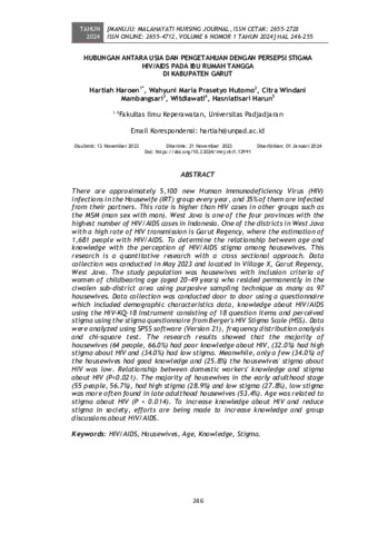 Terdapat 5.100 infeksi Human Immunodeficiency Virus (HIV) baru pada kelompok Ibu Rumah Tangga (IRT) setiap tahunya dan sebagian besar 35% tertular dari pasangannya, angka tersebut lebih tinggi dibandingkan kasus HIV pada kelompok lainnya seperti kelompok MSM (man sex with man). Jawa Barat merupakan salah satu dari empat provinsi dengan jumlah kasus HIV/AIDS tertinggi di Indonesia. Salah satu kabupaten di Jawa Barat yang angka penularan HIV-nya tinggi adalah Kabupaten Garut, perkiraan jumlah orang yang hidup dengan HIV (ODHIV) sebanyak 1.681 orang. Diketahui hubungan usia dan pengetahuan dengan persepsi stigma HIV/AIDS pada ibu rumah tangga. Penelitian ini merupakan penelitian kuantitatif dengan pendekatan cross sectional. Pengambilan data dilakukan pada bulan Mei 2023 dan berlokasi di Desa X, Kabupaten Garut, Jawa Barat. Populasi penelitian adalah ibu rumah tangga dengan kriteria inklusi wanita usia subur (usia 20-49 tahun) yang bertempat tinggal tetap di wilayah tersebut dengan menggunakan teknik purposive sampling sebanyak 97 ibu rumah tangga. Pengumpulan data dilakukan secara door to door dengan menggunakan kuesioner yang meliputi data karakteristik demografi, pengetahuan tentang HIV/AIDS dengan menggunakan Instrumen HIV-KQ-18 yang terdiri dari 18 item pertanyaan dan stigma yang dirasakan dengan menggunakan kuesioner stigma dari Berger's HIV Stigma Scale (HSS). Analisis data dilakukan dengan menggunakan perangkat lunak SPSS (Versi 21), analisis distribusi frekuensi dan uji chi-square. Penelitian menunjukan mayoritas IRT (64 orang, 66,0%) memiliki pengetahuan yang kurang baik tentang HIV, (32.0%) memiliki stigma tentang HIV yang tinggi dan (34,0%) yang memiliki stigma rendah. Sementara hanya sedikit (34,0%) diantara IRT yang memiliki pengetahuan baik dan (25,8%) stigma IRT tentang HIV yang rendah. Hubungan pengetahuan dan stigma IRT tentang HIV (P<0.021). Mayoritas Usia IRT pada tahap dewasa awal (55 orang, 56.7%), memiliki stigma tinggi (28,9%) dan stigma rendah (27,8%), stigma rendah lebih banyak dijumpai pada IRT Usia dewasa akhir (53,4%). Usia memiliki hubungan dengan stigma tentang HIV (P < 0.014). Untuk meningkatkan pengetahuan tentang HIV dan mengurangi stigma di masyarakat dilakukan upaya-upaya peningkatan pengetahuan dan diskusi kelompok bersama tentang HIV/AIDS.