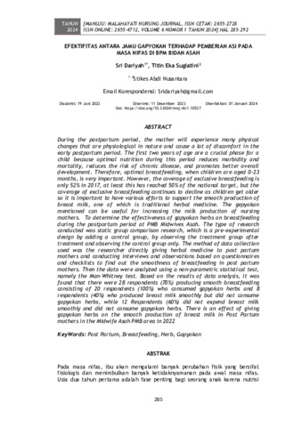 Sri, Dariyah and Titin, Eka Sugiatini (2024) Efektifitas antara jamu gapyokan terhadap pemberian ASI pada masa nifas di BPM Bidan Asah. Manuju: Malahayati Nursing Journal, 6 (1): 26. pp. 285-292. ISSN 2655-2728