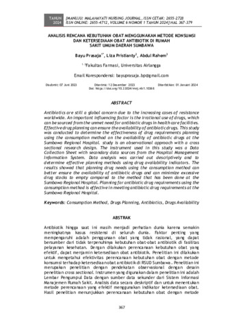 Bayu, Prasaja and Liza, Pristianty and Abdul, Rahem (2024) Analisis rencana kebutuhan obat menggunakan metode konsumsi dan ketersediaan obat antibiotik di Rumah Sakit Umum Daerah Sumbawa. Manuju: Malahayati Nursing Journal, 6 (1): 32. pp. 367-379. ISSN 2655-2728