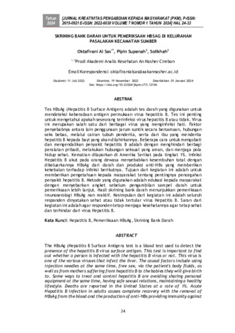 Oktafirani, Al Sas and Pipin, Supenah and Solikhah, Solikhah (2024) Skrining bank darah untuk pemeriksaan HBsAg di Kelurahan Pasalakan Kecamatan Sumber. Jurnal Kreativitas Pengabdian kepada Masyarakat, 7 (1): 3. pp. 24-33. ISSN 2615-0921