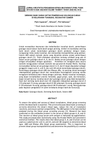Pipin, Supenah and Ikhwani, Ikhwani and Fiki, Setiawan (2024) Skrining bank darah untuk pemeriksaan golongan darah di Kelurahan Tukmudal Kecamatan Sumber. Jurnal Kreativitas Pengabdian kepada Masyarakat, 7 (1): 5. pp. 44-52. ISSN 2615-0921