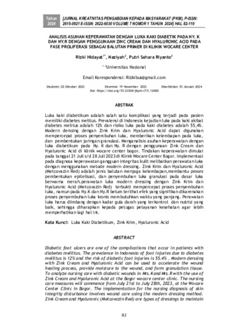 Rizki, Hidayat and Naziyah, Naziyah and Putri, Sahara Riyanto (2024) Analisis asuhan keperawatan dengan luka kaki diabetik pada Ny. K dan Ny. R dengan penggunaan zinc cream dan hyaluronic acid pada fase proliferasi sebagai balutan primer di Klinik Wocare Center Bogor. Jurnal Kreativitas Pengabdian kepada Masyarakat, 7 (1): 9. pp. 82-110. ISSN 2615-0921