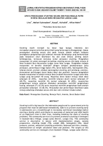 Lina, Lina and Meliani, Sukmadewi and Kasad, Kasad and Alchalidi, Alchalidi and Alfian, Helmi (2024) Upaya pencegahan stunting secara dini pada remaja putri di Desa Seulalah Baru Kecamatan Langsa Lama. Jurnal Kreativitas Pengabdian kepada Masyarakat, 7 (1): 11. pp. 140-149. ISSN 2615-0921