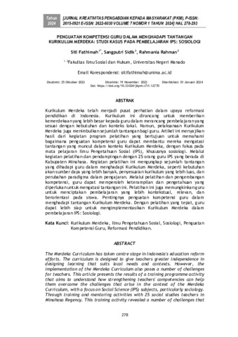 Siti, Fathimah and Sangputri, Sidik and Rahmania, Rahman (2024) Penguatan kompetensi guru dalam menghadapi tantangan kurikulum merdeka: Studi kasus pada pembelajaran IPS: Sosiologi. Jurnal Kreativitas Pengabdian kepada Masyarakat, 7 (1): 24. pp. 278-293. ISSN 2615-0921
