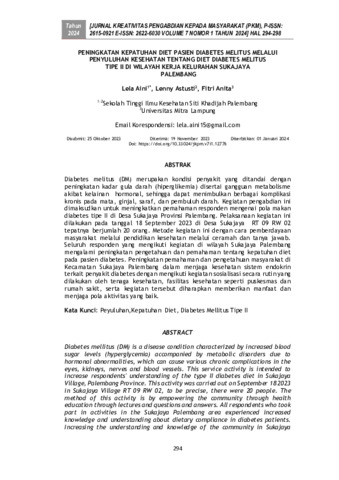 Lela, Aini and Lenny, Astusti and Fitri, Anita (2024) Peningkatan kepatuhan diet pasien diabetes melitus melalui penyuluhan kesehatan tentang diet diabetes melitus tipe II di wilayah kerja Kelurahan Sukajaya Palembang. Jurnal Kreativitas Pengabdian kepada Masyarakat, 7 (1): 25. pp. 294-298. ISSN 2615-0921