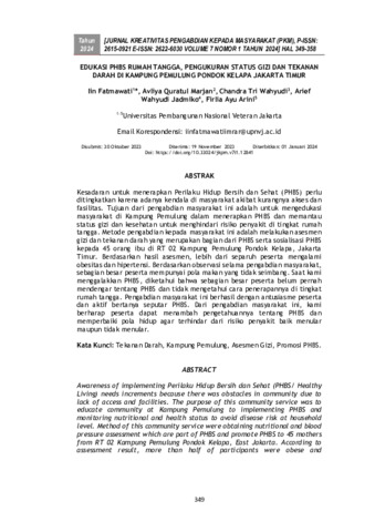 Iin, Fatmawati and Avliya, Quratul Marjan and Chandra, Tri Wahyudi and Arief, Wahyudi Jadmiko and Firlia, Ayu Arini (2024) Edukasi PHBS rumah tangga, pengukuran status gizi dan tekanan darah di kampung pemulung Pondok Kelapa Jakarta Timur. Jurnal Kreativitas Pengabdian kepada Masyarakat, 7 (1): 31. pp. 349-358. ISSN 2615-0921