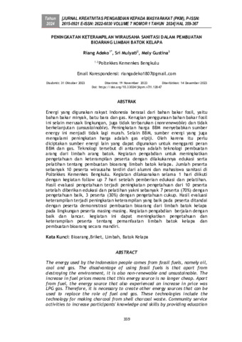 Riang, Adeko and Sri, Mulyati and Mely, Gustina (2024) Peningkatan keterampilan wirausaha sanitasi dalam pembuatan bioarang limbah batok kelapa. Jurnal Kreativitas Pengabdian kepada Masyarakat, 7 (1): 32. pp. 359-367. ISSN 2615-0921