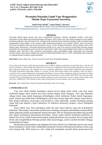 Badril, Munir Kholili and Agung, Nilogiri and Daryanto, Daryanto (2023) Peramalan penjualan liquid vape menggunakan metode single exponential smoothing. Jurnal Aplikasi Sistem Informasi dan Elektronika, 5 (2): 1. pp. 51-56. ISSN 2714-612X