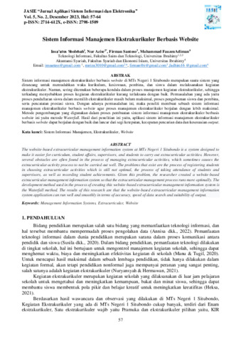 Insa’atus, Sholehah and Nur, Azise and Firman, Santoso and Muhammad, Fauzen Adiman (2023) Sistem informasi manajemen ekstrakurikuler berbasis website. Jurnal Aplikasi Sistem Informasi dan Elektronika, 5 (2): 2. pp. 57-64. ISSN 2714-612X