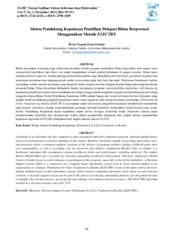 Elvira, Nugrah Fitria Pribadi (2023) Sistem pendukung keputusan pemilihan delegasi bidan berprestasi menggunakan metode ELECTRE. Jurnal Aplikasi Sistem Informasi dan Elektronika, 5 (2): 6. pp. 99-111. ISSN 2714-612X