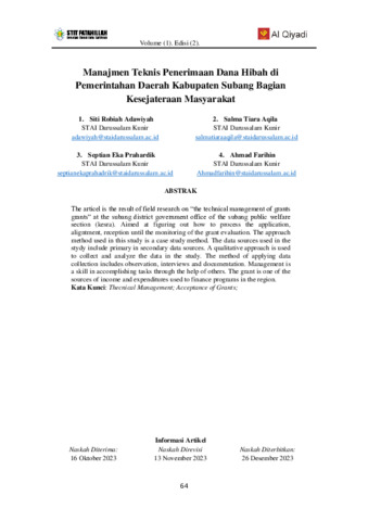 Siti, Robiah Adawiyah and Salma, Tiara Aqila and Septian, Eka Prahardik and Ahmad, Farihin (2023) Manajemen teknis penerimaan dana hibah di Pemerintahan Daerah Kabupaten Subang bagian kesejahteraan masyarakat. Alqiyadi: Jurnal Manajemen Pendidikan Islam, 1 (2): 2. pp. 64-70. ISSN 2988-649X