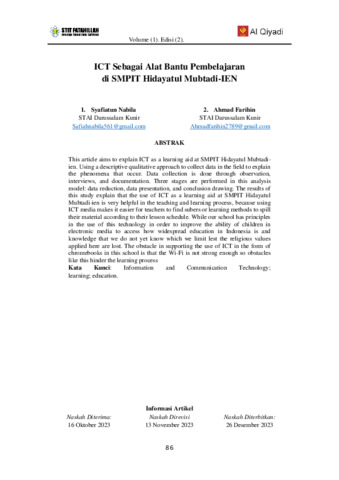 This article aims to explain ICT as a learning aid at SMPIT Hidayatul Mubtadiien. Using a descriptive qualitative approach to collect data in the field to explain the phenomena that occur. Data collection is done through observation, interviews, and documentation. Three stages are performed in this analysis model: data reduction, data presentation, and conclusion drawing. The results of this study explain that the use of ICT as a learning aid at SMPIT Hidayatul Mubtadi-ien is very helpful in the teaching and learning process, because using ICT media makes it easier for teachers to find subers or learning methods to spill their material according to their lesson schedule. While our school has principles in the use of this technology in order to improve the ability of children in electronic media to access how widespread education in Indonesia is and knowledge that we do not yet know which we limit lest the religious values applied here are lost. The obstacle in supporting the use of ICT in the form of Chromebooks in this school is that the Wi-Fi is not strong enough so obstacles like this hinder the learning process.