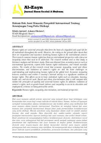 Winda, Apriani and Askana, Fikriana (2023) Hukum hak asasi manusia: Perspektif internasional tentang kesenjangan yang perlu disikapi. Al-Zayn: Jurnal Ilmu Sosial & Hukum, 1 (1): 4. pp. 35-46. ISSN 3026-2925
