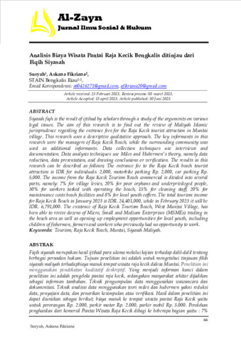 Suryah, Suryah and Askana, Fikriana (2023) Analisis biaya wisata Pantai Raja Kecik Bengkalis ditinjau dari fiqih siyasah. Al-Zayn: Jurnal Ilmu Sosial & Hukum, 1 (1): 7. pp. 66-73. ISSN 3026-2925