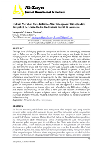 Irmayunita, Irmayunita and Askana, Fikriana (2023) Hukum merubah jenis kelamin atau transgender ditinjau dari perspektif Al-Quran Hadis dan hukum positif di Indonesia. Al-Zayn: Jurnal Ilmu Sosial & Hukum, 1 (1): 8. pp. 74-82. ISSN 3026-2925