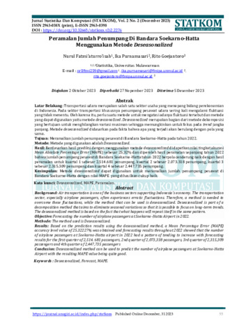 Kesimpulan: Metode deseasonalized dapat digunakan untuk meramalkan jumlah penumpang pesawat di Bandara Soekarno-Hatta dengan nilai MAPE yang dihasilkan cukup baik.