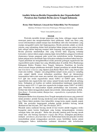 Benny, Diah Madusari and Linayati, Linayati and Mahardhika, Nur Permatasari (2020) Analisis sebaran residu organoklorin dan organofosfat di perairan dan tambak Brebes Jawa Tengah Indonesia. In: Prosiding Pertemuan Ilmiah Tahunan Ke-1V, Masyarakat Limnologi Indonesia, 30 Agustus 2019, Gedung Kusnoto LIPI Bogor.