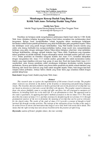 Penelitian ini bertujuan untuk mengeksplorasi pelaksanaan ibadah Israel abad ke 8 SM. Kritik Nabi Amos ditujukan terhadap kegagalan bangsa Israel dalam memaknai dan melaksanakan ritual keagamaan. Bangsa Israel memperlihatkan sebuah kegagalan dalam membangun kehidupan kerohanian terlihat dalam praktik peribadatan yang tidak berlandaskan pada pengabdian kepada Tuhan dan kehidupan sosial yang penuh dengan ketidakadilan. Sang Nabi hendak mencela mereka yang selalu setia datang beribadah dan mempersembahkan kurban, tetapi masih terus mempertahankan kelakuan yang jahat, dengan melanggar hukum Tuhan dalam hidupnya sehari-hari. tetap melakukan berbagai ketidakadilan, sehingga menjadi kekejian bagi Tuhan Allah. Pendekatan yang digunakan dalam penelitian ini adalah kualitatif, dengan menerapkan metode deskriptif analisis pada teks Amos 4:4-5. Dalam penelitian ini diuraikan mengenai konteks dari Amos 4:4-5, kemudian dilanjutkan dengan menguraikan teks Amos 4:4-5 melalui analisis gramatikal teks untuk merumuskan makna ibadah yang dapat dijadikan relevansi bagi gereja di masa kini. Hasil dari kajian Kitab Amos 4:4-5 memberikan suatu konsep pemikiran untuk membangun kehidupan kerohanian melalui kegiatan peribadatan. Konsep perwujudan ibadah yang benar dalam penelitian ini adalah sebuah tindakan yang didorong oleh hasrat dan motivasi yang rindu untuk mengabdi kepada Tuhan, baik dengan kata-kata maupun dalam perbuatan. Artinya bahwa ibadah yang benar harus juga senantiasa diikuti dengan praktek hidup benar.