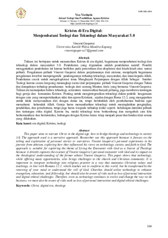 Tulisan ini bertujuan untuk menarasikan Kristus di era digital, bagaimana menjembatani teologi dan teknologi dalam masyarakat 5.0. Pendekatan yang digunakan adalah pendekatan naratif. Peneliti menggunakan pendekatan ini karena berfokus pada penceritaan dan eksplorasi dari kisah-kisah atau narasi pribadi. Pengalaman pribadi Vincent Gaspersz dalam perjalanannya dari ateisme, menjelajahi bagaimana pengalaman tersebut mempengaruhi pandangannya terhadap teknologi, masyarakat, dan iman kepada Allah. Pendekatan cocok untuk mengeksplorasi tema Menghayati perjumpaan dengan Allah sebagai sumber teologi karena secara langsung menangkap esensi dari perjumpaan pribadi Vincent Gaspersz dengan Tuhan dan dampaknya terhadap pemahaman teologis dari seorang mantan ateis yang bernama Vincent Gaspersz. Tulisan ini menunjukan bahwa teknologi, sementara menawarkan banyak peluang, juga membawa tantangan bagi gereja dan komunitas Kristen. Penting untuk mengintegrasikan teknologi dalam praktik keagamaan dengan cara yang mempertahankan nilai dan ajaran Kristiani, sejalan dengan Roma 12:2, yang mengajarkan untuk tidak menyesuaikan diri dengan dunia ini, tetapi berubahlah oleh pembaharuan budimu agar memahami kehendak Allah. Gereja harus memanfaatkan teknologi untuk meningkatkan penginjilan, pendidikan, dan persekutuan, tetapi juga harus waspada terhadap risiko seperti kehilangan interaksi pribadi dan tantangan etika digital. Karena itu, meski teknologi terus berkembang dan mengubah cara kita berkomunikasi dan berinteraksi, hubungan dengan Kristus harus tetap menjadi pusat dan fondasi dari semua yang dilakukan.