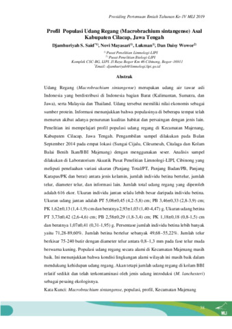 Djamhuriyah, S. Said and Novi, Mayasari and Lukman, Lukman and Daisy, Wowor (2020) Profil populasi udang regang (Macrobrachium sintangense) asal Kabupaten Cilacap, Jawa Tengah. In: Prosiding Pertemuan Ilmiah Tahunan Ke-1V, Masyarakat Limnologi Indonesia, 30 Agustus 2019, Gedung Kusnoto LIPI Bogor.